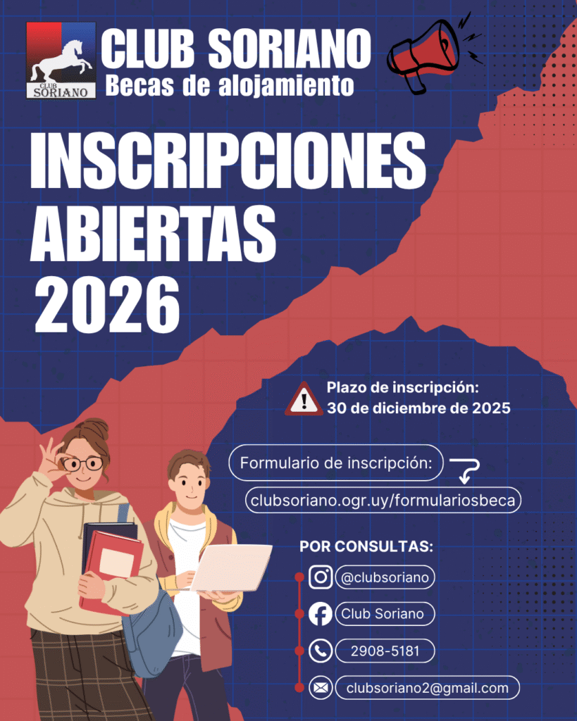 El Club Soriano informa que se encuentra abierta la convocatoria para las Becas de Alojamiento 2026, destinadas a jóvenes del departamento de Soriano que deseen continuar sus estudios en la capital del país.